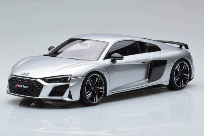 A 1:18 scale model measures approximately 25-28 cm (approximately 10-11 inches). The Audi R8 Performance Sudrabs Kengfai 1:18 is perfect for display in a glass cabinet or on a shelf.