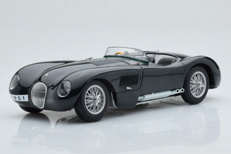The Jaguar C-Type Zaļš AUTOart 1:18 is crafted from Metāls. Die-cast zinc alloy body with detailed plastic parts, rubber tires, and high-quality paint finish. Die-cast models are known for their weight, durability, and realistic feel.