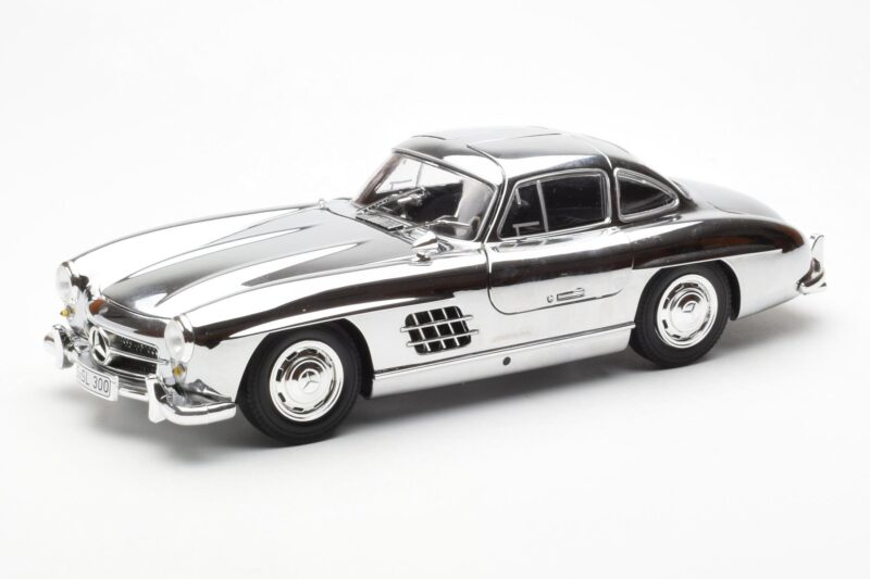 The Mercedes 300 SL W198 Hroms Minichamps 1:18 is crafted from Metāls. Die-cast zinc alloy body with detailed plastic parts, rubber tires, and high-quality paint finish. Die-cast models are known for their weight, durability, and realistic feel.