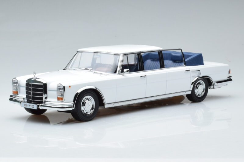 The Mercedes 600 Pullman W100 Landaulet Balts KK-Scale 1:18 is crafted from Metāls. Die-cast zinc alloy body with detailed plastic parts, rubber tires, and high-quality paint finish. Die-cast models are known for their weight, durability, and realistic feel.