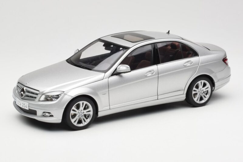 The Mercedes C-Class W204 Avantgarde Sudrabs AUTOart 1:18 is crafted from Metāls. Die-cast zinc alloy body with detailed plastic parts, rubber tires, and high-quality paint finish. Die-cast models are known for their weight, durability, and realistic feel.