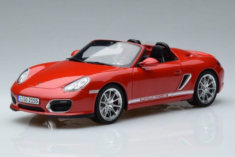 A 1:18 scale model measures approximately 25-28 cm (approximately 10-11 inches). The Porsche Boxster Spider 987 GT Spirit 1:18 is perfect for display in a glass cabinet or on a shelf.
